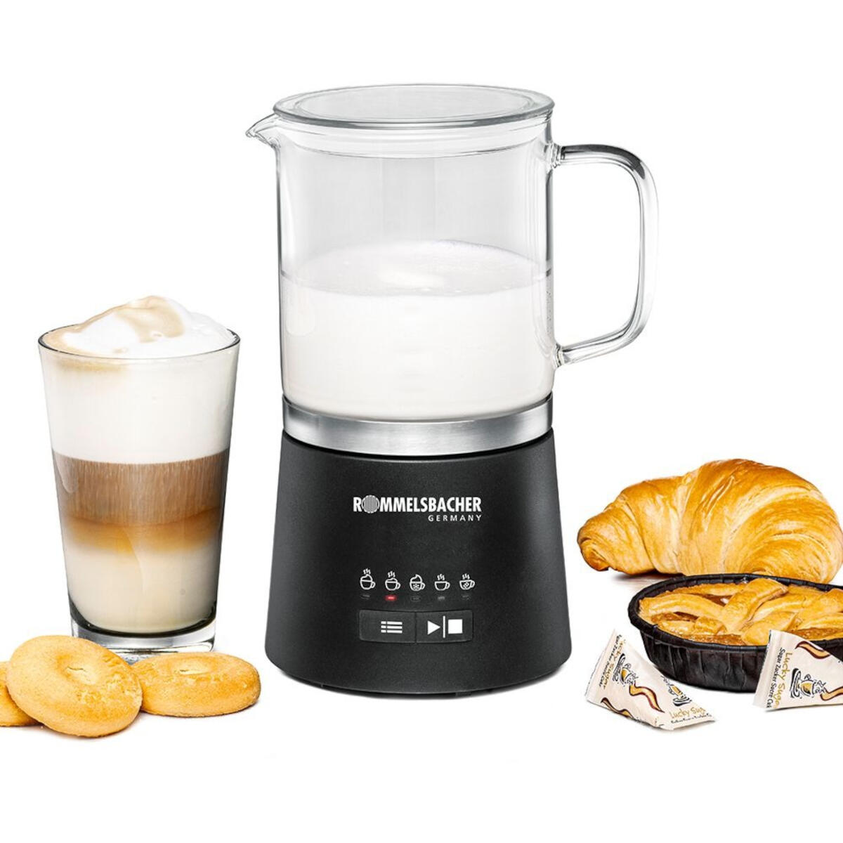 Rommelsbacher MS 625 – Electric Milk Frother – 600 W Power – 5 Programmes – Removable Glass Jug – Hot & Cold Foam – 250 ml Frothing / 500 ml Capacity