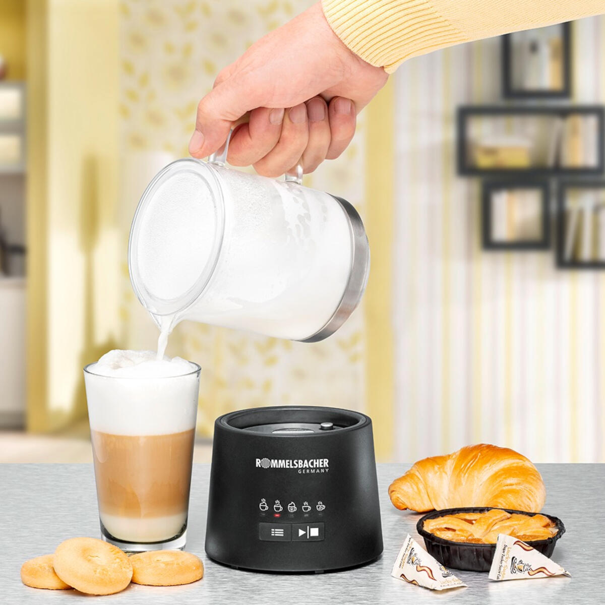 The Rommelsbacher MS 625 milk frother is a versatile countertop appliance designed to prepare both hot and cold milk froth from dairy or plant-based milks. With five automatic programmes and a removable glass jug, it delivers consistent results for coffee specialties and more.