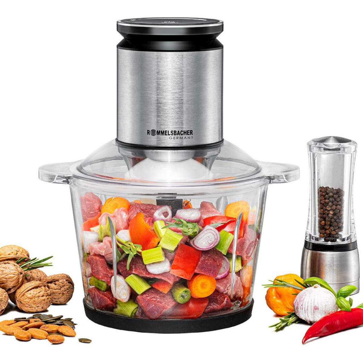 Rommelsbacher MZ 800 Multi Chopper – 2.7 L Glass Bowl Capacity – Stainless Steel Housing – 9-Winged Special Blade – 22-Stage Speed Control – Safety Interlock System