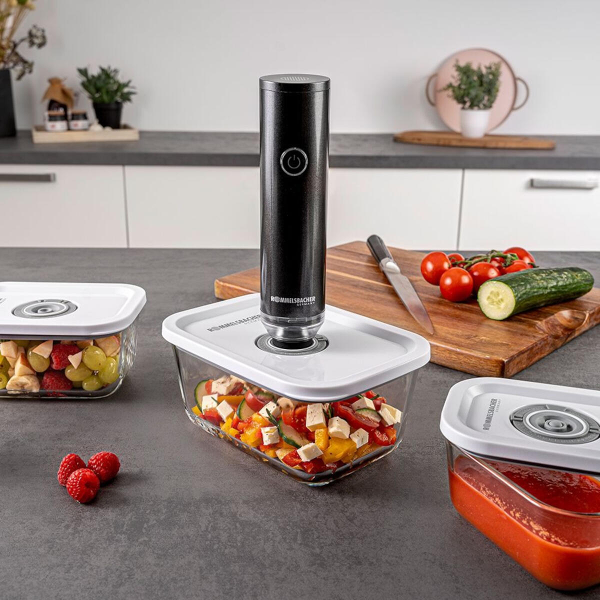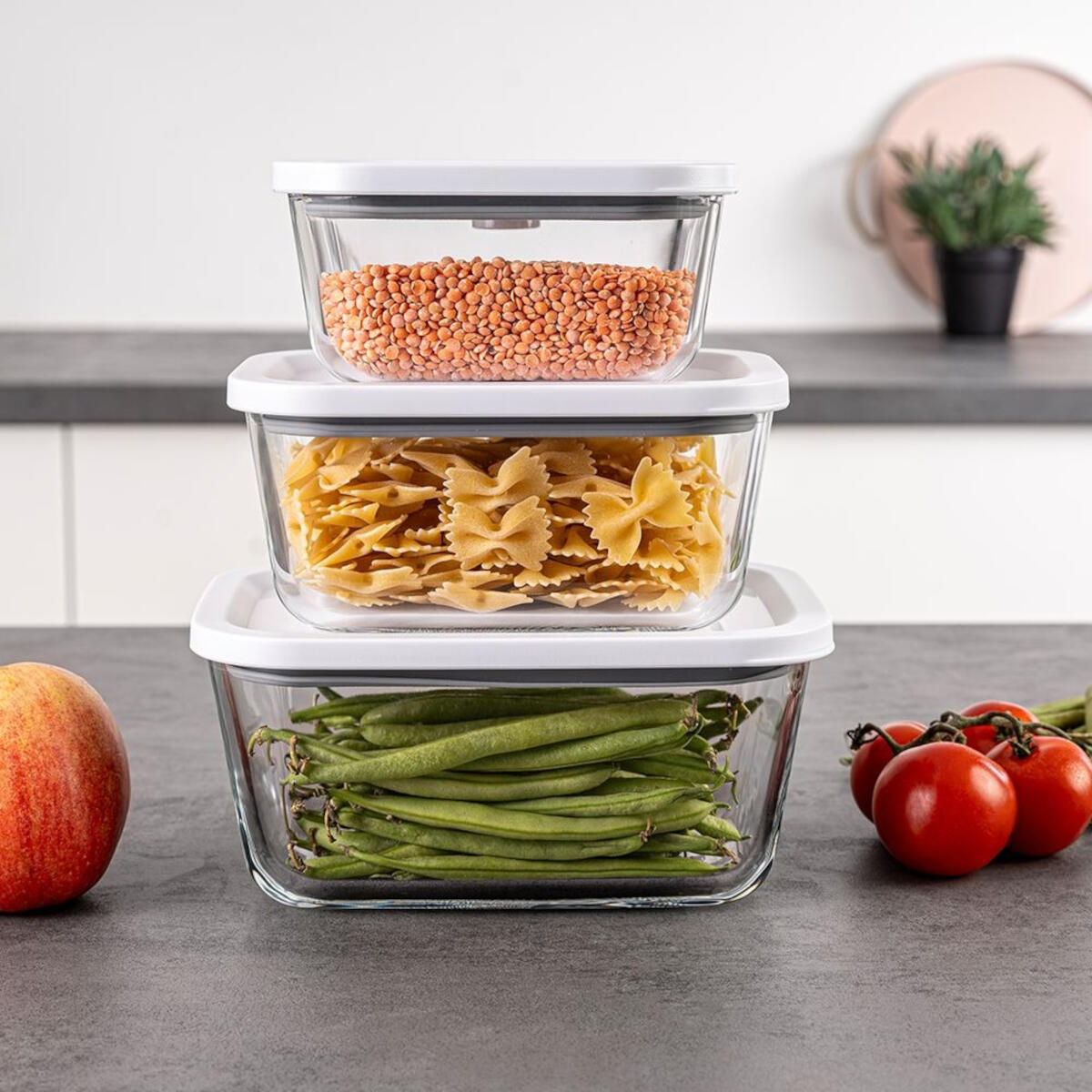 - Three Glass Vacuum Containers: Includes 350 ml, 670 ml, and 1100 ml borosilicate glass containers that are BPA-free, dishwasher-safe and suitable from -18 °C to +230 °C with lids featuring date indicators.